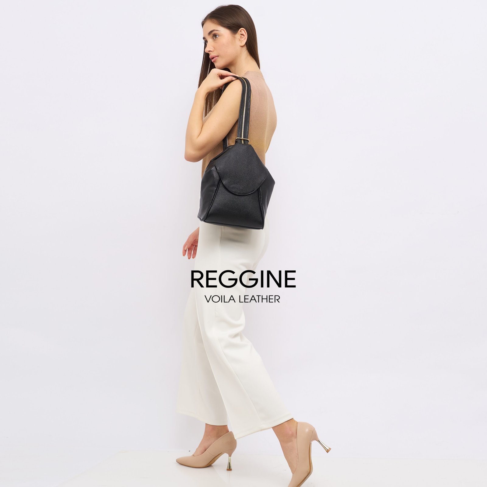 Reggine, terbuat dari kulit sapi jenis milling dengan teksture jeruk kelas premium finishing glossy , terdapat dua pilihan warna yaitu coklat havana dan hitam elegan. Mempunyai karakter kulit yang lemas lentur empuk tidak keras enak di genggam dan nyaman. Ransel ukuran medium ini mempunyai kantong pada bagian luar (depan tas) dan bagian belakang tas.